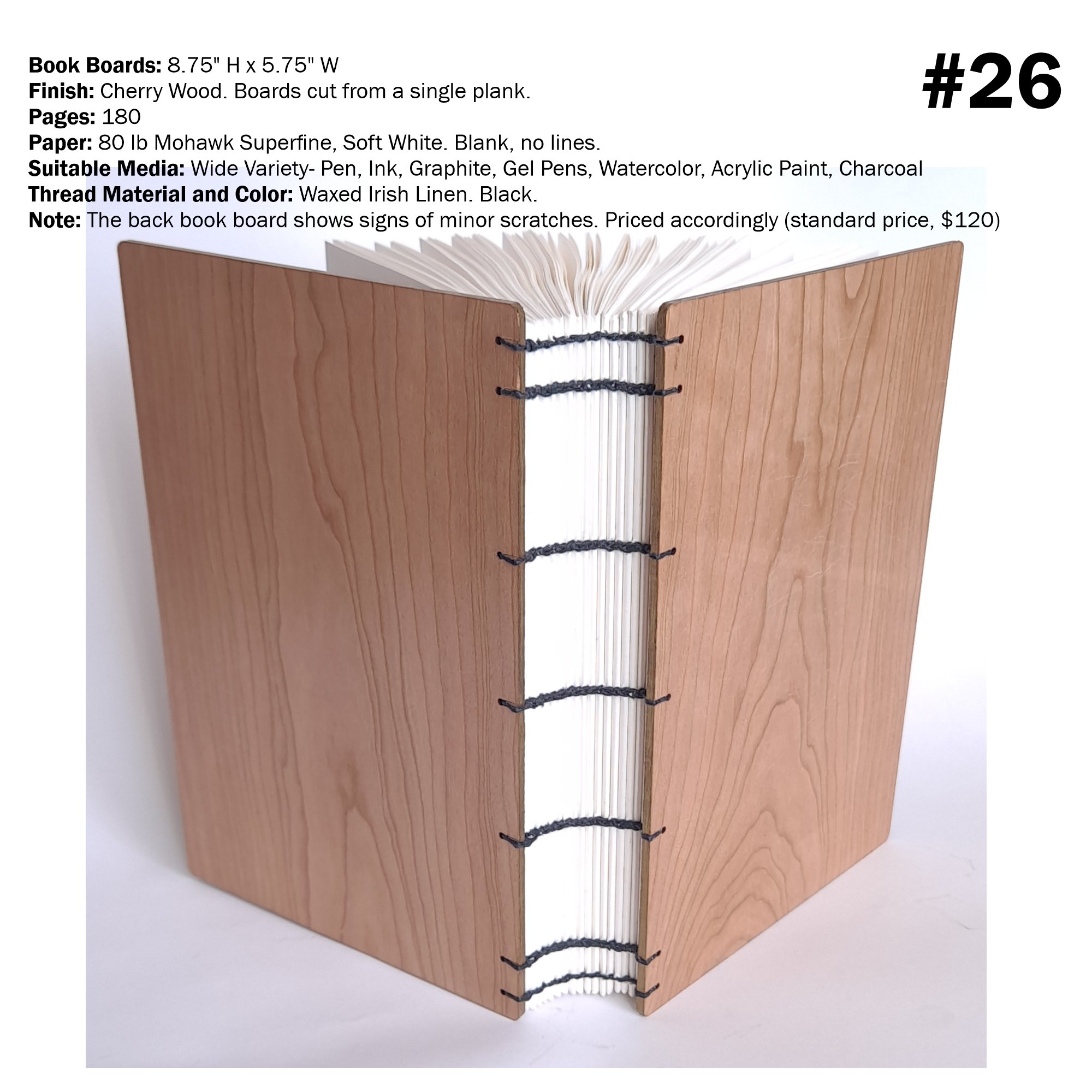 Using wood book boards allows me to create a durable book where the materials will always make each piece distinct. While there is a risk of the book cover cracking, it can be repaired by drilling small holes on either side of the crack, gluing, and sewing across the crack. I offer book board repair for a nominal fee.